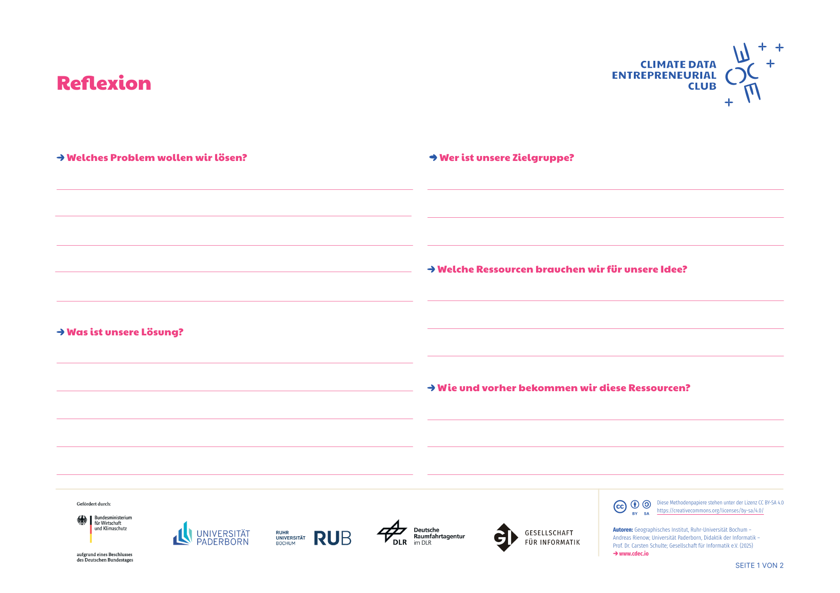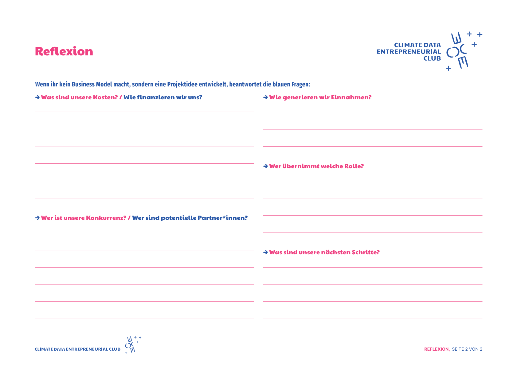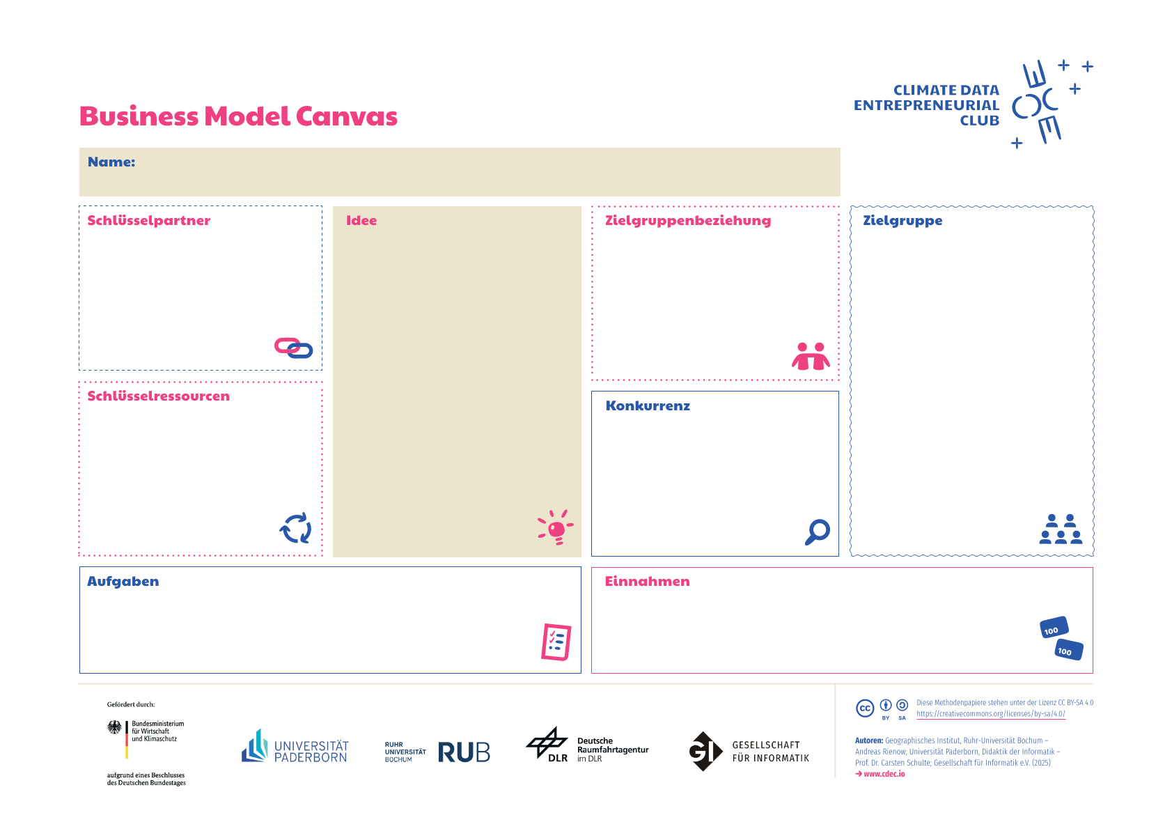 Aufgabe: Nutzt das Arbeitsblatt um eure Idee zu reflektieren und füllt anschließend das Buisness-Model-Canvas aus. Das hilft euch eure Idee kritisch zu reflektieren und in die Tat umzusetzen.